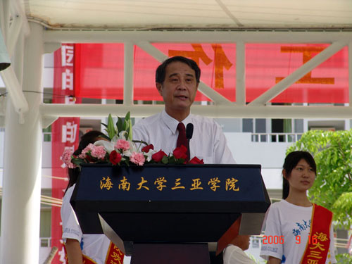 陆志远市长出席讲话 李书福先生寄语新生 军训阅兵仪式随之进行 9月16日下午,我院椰林大道上彩旗飘飘,鼓乐阵阵,到处洋溢着喜庆的气氛,2006新学年开学典礼在田径场隆重举行。三亚市市长陆志远,我院资助人、吉利集团董事长李书福,省教育厅副厅长史贻云,海南大学副校长康耀红以及省市有关领导出席了开学庆典。我院党委书记、执行院长陆丹在致辞中对各位领导和来宾表示热烈欢迎。开学庆典由沈为平院长主持。 三亚市委副书记、市长陆志远在庆典上肯定了我院建校一年来的发展,称赞我院在“两节一赛”、黎族“三月三”等三亚大型活动中做出的贡献,认为我院已成为三亚的一张城市名片,对提高三亚的城市地位和文化氛围起到很好的促进作用。他表示,三亚学院是海南省更是三亚市的重点建设项目,市委市政府将一如既往地支持学院发展。 李书福先生特地从北京赶来参加我院庆典并作了热情洋溢的讲话。他寄语新生,希望同学们在三亚学院好好学习、大胆实践,勇于挑战困难,不断攀登科学技术与社会实践的新高峰,为中国改革开放和现代化建设贡献力量。 随后,我院2006级新生列起方阵,喊起口号,接受军训检阅。