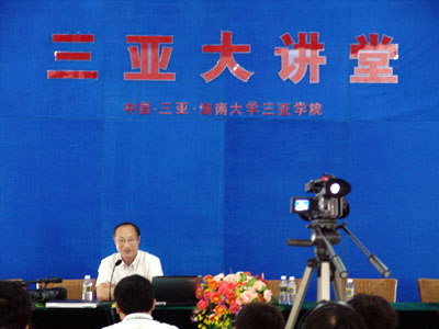 仪式后张教授在500人礼堂为我院师生做了一场题为《社会转型与中国特色》的精彩报告,张教授从毛泽东时代的人民公社讲到了改革开放后的社会主义现代化建设,从乡村体系讲到了政府党政权利系统,从历史讲到了现在,阐述了我国在社会转型过程中的中国特色。 最后,三亚学院社会发展研究所所长沈关宝教授总结了张教授的报告,并提出了中国人不应该忘记自己的历史传统,应该很好地继承和发扬中华民族的优良传统,做一个真正的中国人。场内顿时响起了雷鸣般的掌声。张乐天教授不仅为我们做了一次精彩的报告,也使我院师生接受了一次十分深刻的爱国主义教育。
