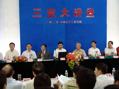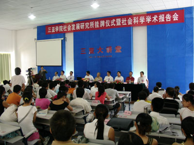 三亚学院社会发展研究所挂牌仪式现场 2006年10月14日,对于三亚学院、三亚市甚至整个海南省来说,是一个具有特殊意义的日子。这一天的下午3点,海南大学三亚学院社会发展研究所挂牌仪式正式开始。 整个挂牌仪式由学院党委书记、执行院长陆丹教授主持。出席这次挂牌仪式的有中科院院士、曾为我国发展“两弹一星”作出突出贡献的王守觉院士,三亚市常委、常务副市长严之尧、市人大常委会副主任林志坚等市领导以及被聘为研究所研究员的8位博士生导师及学院领导。 首先秦院长宣读了学院《关于成立三亚学院社会发展研究所的决定》。三亚学院社会发展研究所组成人员如下: 所长:沈关宝教授 副所长:陆丹教授 研究员:博士生导师沈为平教授;清华大学社会学系博士生导师孙立平教授;同济大学建筑城规学院城市规划系系主任、博士生导师、上海市政府决策咨询专家赵民教授;复旦大学社会发展学院副院长、博士生导师张乐天教授;西南大学公共管理与社会发展学院院长、博士生导师秦启文教授;上海大学宗教与社会研究中心主任、博士生导师李向平教授;上海大学社会学系常务副主任、博士生导师、中国人类学会常务理事张江华教授;华东理工大学徐永祥教授、以及海大三亚学院硕士生导师孙仁佳教授等一批知名专家为学院社会发展研究所研究员。接着由学院院长沈为平教授和三亚市人大常委会副主任林志坚为研究所揭牌。