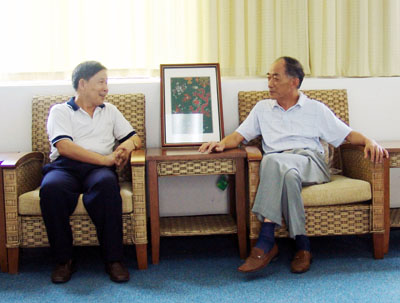 广州市教育局高等教育处李炳珊处长(左)和秦杰锋副院长(右)亲切交谈