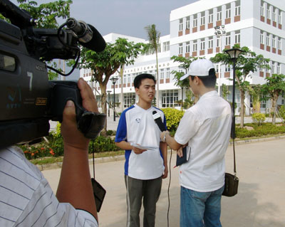 苏占伟同学向记者畅谈在三亚学习、生活的体会 美文欣赏《物华天宝话三亚》 法学分院06级新生苏占伟怎么也没想到,刚来学院两个月就成了三亚市的新闻人物——因参加“广电杯”三亚城市名片征文比赛荣获大中专组一等奖。10月25日下午,三亚电视台记者专程来学院采访了苏占伟同学,并在三亚电视台晚间新闻节目播出。 提起获奖经历,刚得到这一消息的苏占伟笑得很灿烂。离开中原老家来到中国最南端的滨海城市上大学,他感到一切都很新鲜,正巧这时三亚市政府组织的三亚城市名片征集活动进行得如火如荼。三亚究竟是怎样一座城市?三亚学院所处的城市环境究竟怎样?他对此很感兴趣。于是,他通过电视、报纸、网络查阅了大量资料,并进行了实地调查,慢慢地对三亚市有了较全面的认识。经过认真细致的构思,精心组织材料,满怀激情地写下了《物华天宝话三亚》的散文,积极参与了征文活动,没想到竟获得了一等奖。 采访结束后,学生处处长邹兴海勉励他说,这次获奖是你的一个新起点,对你以后的学习、生活都会起到很好的促进作用,千万不要停留在原地沾沾自喜,一定要好好把握机会,勤奋学习,多写文章,不断提高自己的思想境界和写作水平。