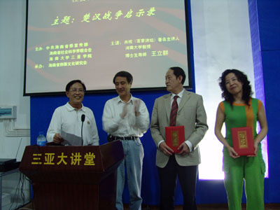 王立群教授、隋丽娟教授与学院领导合影留念2006年12月14日晚,中央电视台《百家讲坛》主讲人、博士生导师王立群教授应邀前来学院“三亚大讲堂”讲授《楚汉战争启示录》。学院上千名师生目睹名师风范,亲耳聆听大师讲演,报告会由学院副院长、社会发展研究所所长、博士生导师沈关宝教授主持。 公元前206年——前202年的“楚汉战争”以刘邦集团战胜项羽集团而告终。王立群教授凭借深厚的学术修养,将学术观点融入到平易而风趣的话语之中,通过讲解这场战争的背景,分析这场战争胜负的原因,以及对刘邦和项羽不同性格的对比,把我们带回了“巨鹿之战”、 “鸿门宴”、 “彭城之战”、“三杰归汉”、“四面楚歌”等脍炙人口的历史事件中,让我们一起去品味历史的沧桑变幻和英雄的悲壮命运。同时,王立群教授还结合当今社会的现象讲解历史的厚重,给在场师生带来了诸多有益的启迪与思索。 这是一场颇具“学术品位,大众口味”的精彩报告。报告结束后,师生们掌声经久不息。在与大师对话环节,学生们纷纷举手向王教授请教问题,如“刘邦的性格特征对当今企业而言有哪些意义?”“怎样看待刘邦和刘彻这两个汉代皇帝?”等,王教授都耐心地一一解答。 报告会开始前,学院聘请王立群教授和隋丽娟教授为学院客座教授,两位教授欣然接受并随即表示,感谢三亚学院给予自己的认可与荣誉,在以后的工作中将不断研究、探索,将继续关注和支持三亚学院的发展,并期待与三亚学院师生的下一次面对面交流尽早到来。 相关链结