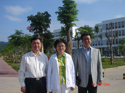 吴启迪副部长(中)、史贻云副厅长(左)和陆丹院长(右)合影 2006年12月16日上午,教育部副部长吴启迪在海南省教育厅厅长黄国泰、副厅长史贻云的陪同下,在三亚专程视察了三亚学院。 在听取党委书记、执行院长陆丹教授的工作汇报后,吴部长对学院围绕育人理念进行人才培养方案、教学计划的修订、课程改革、师资培训,以及围绕教学并结合地方文化与经济特点展开社会科学理论研究,围绕育人体系进行人事等管理制度进行整体设计、推动改革表示很大兴趣,并不时点头赞许。其后,吴部长对独立学院的未来发展寄予希望,并就三亚学院今后瞄准新兴经济搞好学科建设,进行人才培养作了重要指示。 随行的黄国泰厅长对两年来学院的进步及现在的发展势头表示肯定,并进一步寄予期望。