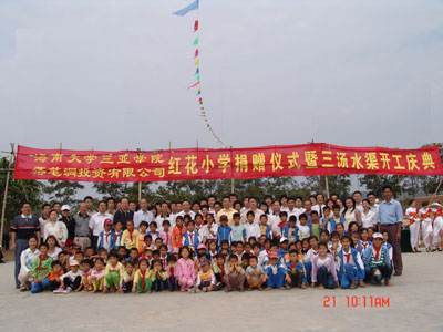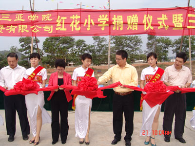 学院执行院长陆丹教授,副院长秦杰锋教授、钱倚剑教授等院领导;落笔洞投资有限公司副总经理刁林、王海云等都亲自到场,见证这令人激动的一幕。参加今天签约仪式的有三亚市副市长容丽萍、三亚市委副秘书长廖民生、三亚市政府副秘书长陈小亚、三亚市教育局副局长孙有泰、三亚市田独镇镇长李骥等。 2006年8月,人文与传播分院的朱俊燕同学在一次认识实习中发现红花村小学师资缺乏,于是她在全院范围内招募了40名志愿者到红花村小学义务支教,受到小学师生和当地村民的欢迎。他们的事迹得到了分院及三亚学院领导的支持。本学期开始,人文与传播分院、学生处组织“鸣鹰”支教队成员及部分教师,根据支教队的实践经验和小学教育特点,组织讨论,制定支教教学计划,把学生自发的爱心活动变成学院自觉参与的支教活动。
