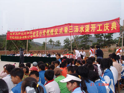 容丽萍副市长、陆丹院长、廖民生副秘书长、陈小亚副秘书长等为三汤水渠开工剪彩2007年3月21日上午9:00,红花村小学显得格外热闹。学院支教红花村小学签约仪式暨三汤水渠开工庆典在这里隆重举行。