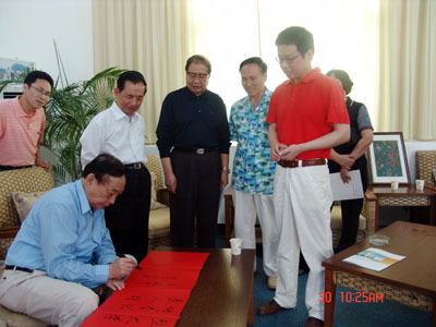院领导与来宾合影2007年3月30日上午,全国人大常委会委员、全国人大教科文卫委员会副主任蒋祝平,中国书法家协会会员、中国文联书画艺术中心主任、中国文联副主席、党组副书记高运甲,十届全国人大教育科学文化卫生委员会委员黄学禄等,在三亚市人大副主任林志坚的陪同下来学院视察。三亚市人大常委、院党委书记、执行院长陆丹教授接待了来宾。 陆丹教授向来宾介绍了学院在海南省委省政府、三亚市委市政府以及海南省教育厅的关怀下,精心策划、科学组织、艰苦创业,仅用9个月时间完成学院各项基础设施建设,并实现当年招生、当年开学。蒋主任一行对学院在较短时间内建成这样一所基础设施完善、内部管理规范、校园环境优美的本科院校点头称赞;对学院的育人理念、“311”课程体系和“大旅游、大休闲、大文化”办学特色给予了很高评价;对李书福先生热心资助教育事业表示赞赏。 陆院长向来宾详细介绍了校园二期建设的规划布局、建筑风格等情况,并陪同来宾乘电瓶车参观了校园。各位领导对学院的发展充满了希望,相信三亚地区优越的地理和自然条件会为学院吸引一批优秀人才,三亚学院必将迎来更加美好的明天。 最后,书法家高运甲先生欣然为学院留下了墨宝:“创建新型大学 培养优秀人材”。