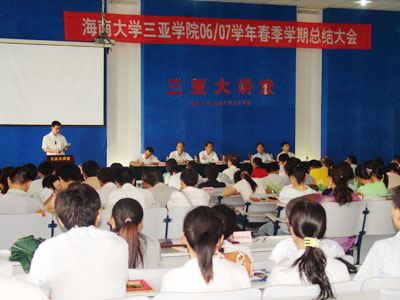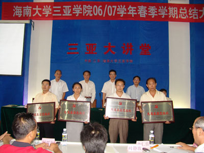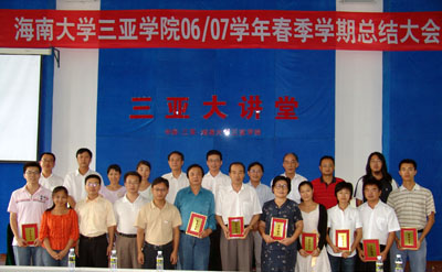 优秀共产党员与院领导合影 2007年6月28日下午,海南大学三亚学院06—07学年春季学期总结大会在学院五百人礼堂召开。院党委书记、执行院长陆丹教授,院长沈为平教授,副院长沈关宝教授,秦杰锋教授等院领导和各部门、分院负责人出席了会议,全院近四百名教职工参加了会议。 会上,沈为平院长宣布了06—07学年课堂教学优秀教师名单。经过督导评教、分院评教和学生评教三个环节综合评定,代旭辉等31名课堂教学一线工作者获得此项荣誉。31名优秀教师中,中青年教师占绝大多数,充分体现了学院强大的师资潜力和中青年教师的教学水平。 沈关宝副院长对本学期科研工作取得的成绩做了总结。首先,学院既定的科研目标有了重大突破,王永波同志申报的国家课题《股票市场与普通产权交易市场市场结构的差异性研究》通过全国哲学社会科学规划领导小组审批,获准国家社会科学基金项目立项;其次,学院还取得了多项省级研究课题。沈院长还对正在申报的几项课题做了点评,鼓励全院教职工在教学科研方面继续努力,争取再创佳绩。 学院党委委员、副院长秦杰锋教授宣布了2006-2007年度先进基层党支部、优秀共产党员名单:法学分院、人文与传播分院、旅业管理分院、外语分院党总支(直属党支部)获得先进基层党组织荣誉称号,王永波等22名同志获得优秀共产党员称号。 执行院长陆丹教授代表学院对全院教职工一年来的辛勤工作表示感谢,对学院几项重要工作进行了总结:首先,教学计划的修订是实现学院办学理念和“311”教学模式所实施的具体举措,符合教育部2007年1号、2号文件精神,在教学实践中自觉走在了前面;第二,科研工作开始起步,并且有了突破,科研要成为学院践行育人理念的一部分,成为学院事业发展的一个推动力;第三,教学计划、教学规范、机关管理和后勤服务等方面的工作有了很大的提高,进一步加强了对执行力的推动和考核,在行政机关率先执行服务规范,为形成“流程通畅、沟通顺畅、心情舒畅”的良好氛围奠定了基础。 陆院长还通报了一年来我院学生取得的主要荣誉:获得国家级奖励的有2005级艺术分院“瞳”工作组作品入围第十六届金犊奖;获得省级奖励的有在海南省国土环境资源厅举办的第38个世界地球日征文比赛的特等奖、二等奖和三等奖,省“世界地球日”文艺汇演一等奖;海南省首届大学生电子设计竞赛一等奖、二等奖、三等奖。 最后陆院长说,在执行新的教学计划的一年里,学院各项工作有序进行,在很多方面都取得了令人骄傲的成绩,希望在新的年里有更好的收获。