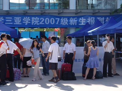 办理报到手续 “有朋自远方来,不亦乐乎?” 为了一个共同的目标——“学生走进校园的目的是为了更好的走向社会”,我们来了!你们来了!从此,我们晨读的声音将共同响彻教室、椰林,我们的身影将共同跳跃在运动场、月光下,我们的脚步将共同奔跑、踏浪,结伴世界小姐、世界先生、亚洲政要、会展经济、“泰坦尼克”(邮轮)经济……,我们将共同在蓝天白云下,大海边,沙滩上,放飞我们走上社会的青春梦想! 我们的事业象海洋 我们共同来到了大海旁! 21世纪是海洋的经济!尾随着农业经济、工业经济、消费经济,海洋经济正呼啸而来;21世纪是蓝海经济!智慧、人才、观念是新经济的本质和制高点。三亚学院秉持新理念,注重培养健康人格与五种能力,加强学生全面素质建设,注重用得着、带得走、接得上应用技能与专业素养的提高,努力保障学生上岗就业与生涯发展的高可靠性。 海纳百川,酝酿风云。我们从全国30个省、市、自治区聚集在三亚学院,我们坚信,我们一定能够在未来的世界展翅高飞、叱咤风云! 愉快学习 自主成长 千里之行,始于足下,理想属于未来,更属于现实的奋斗,学习、成长便是奋斗的主旋律。我们愉快,因为我们的学习终于摆脱了高考烦人的指挥棒,走近了丰富的社会需求,走近了自己的兴趣选择!我们的生活与未来将由自己亲手安排! 我们崇尚了解学科、专业历史及现实走向的学习,我们崇尚注重学习能力、实践能力、沟通与适应能力、创新能力及可持续发展能力培养的学习,崇尚调动学生感性认识与动手欲望的学习,崇尚以学生学习为中心的教与学!我们崇尚在班级活动、社团活动、三级实习、社会实践、宿舍等团体人际交往中塑造自己的健康人格, 确定自己的社会定位,锤炼、提高自我的社会角色禀赋,自己安排自己的生涯规划与成长历程。 了解社会,了解并设计自我,创新、创业、创价值,未来属于你,属于我。 让我们一起来奋斗吧!愉快学习,自主成长,新同学,欢迎你!