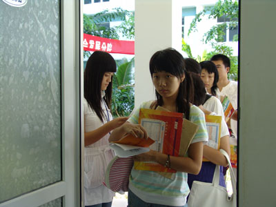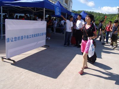 独立办理报到注册手续(三) 从9月1日起,来自全国30个省市的新生和家长,乘着学院迎接新生的专用大巴来学院报到。校内搭建起大红色的充气拱门,处处悬挂着标语,横幅,一派热闹喜庆的气氛。 “请让您的孩子独立完成报到过程。”学院新生报到现场,首先映入眼帘的是这样一块别具一格的提示牌。为了让孩子尽快地适应大学生活环境,培养独立自主的生活态度,学院规定,新生必须独立完成入学报到手续,陪同前来的父母则被安排到学院千人礼堂和五百人礼堂的空调大厅内休息。 新生通过自主完成缴费注册、领取入住通知单、领取军训服装等入学手续的办理,能够尽快的熟悉和适应校园生活,这也是学院对学生学习能力、实践能力、创新能力、可持续发展能力和适应能力培养的初步显现。 受学院“愉快学习,自主成长”氛围影响,一些2007级新生在独立完成报到手续后,就主动投入到迎新志愿者的行列中,人文与传播分院的刘雨霏就是很好的例子,她刚刚完成了报到手续的办理,就主动参与到学生干部发放《海南大学三亚学院报》的队伍中,为帮助新生和家长更好地了解学院作出了自己的努力。欧阳一帅也是这样。作为2007级刚刚报到的新生,他看到比自己大一、两个年级的师兄、师姐都能在迎接新生中独挡一面,觉得自己也要向他们学习,从入学第一天开始就要学会自主成长,主动要求进步,帮助高年级的学生干部迎接新同学。 谈起学院鼓励学生独立完成报到手续的做法,一位来自内蒙古的家长深有感触地说,女儿长这么大,都是在父母的照顾下生活的,现在让她一个人报名,有些不放心,但听了工作人员的解释以后,理解了学院的良苦用心,孩子将要面对大学的独立生活,早一点锻炼对她有好处。另一位来自辽宁的家长则非常爽快地说:“孩子不锻炼哪能行!学院这么做非常对!要让孩子明白自己是大人了,不能事事都依靠父母。”家长们普遍认为,亲身感受过才知道,学院的硬件、软件、管理方式他们都看在眼里,对学院的前景、对孩子的前途都充满了信心!
