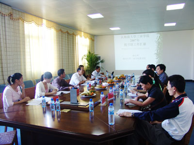 检查书目查询系统2007年12月17日,海南省教育厅本科高校图书馆检查团来学院指导工作。副院长秦杰锋教授、图书馆馆长杨宗英教授接待了检查团。