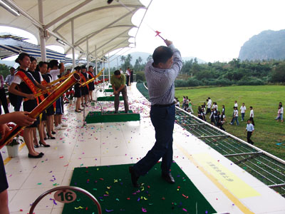 嘉宾开球 12月19日下午,三亚学院高尔夫练习场开杆仪式在南国温暖的阳光中隆重举行,至此学院成为海南省第一所拥有校内高尔夫练习场的高校。据悉, 目前国内属于本科层次同时拥有自己独立练习场和高尔夫实习基地的院校寥寥无几。 应院党委书记、执行院长陆丹教授邀请,三亚市副市长李柏青、市教育局局长曹瑜、市文体局局长廖民生、市旅游发展局副局长陈敏建、三亚电视台副台长杨宁、三亚晨报副总编辑邢洪飚以及三亚鹿回头高尔夫球会等多家业内企业老总到场挥杆开球。 伴随着经济持续发展及高尔夫运动在商务交际中作用的日益凸显,高尔夫运动已逐渐告别“奢侈运动”的名头,越来越为人们所熟知和热衷。长年无冬、日照充足、空气清新,一年365天都可尽情挥杆的海南更成为了高尔夫运动的热点地区。省政府也已明确提出,要将海南岛建设成为“高尔夫球岛”。目前,海南省高尔夫球场已达17家,然而由于开设高尔夫专业受实践场地所限且培养成本较高,各种管理人员及球童普遍奇缺。专业人才成为了制约高尔夫产业发展的“瓶颈”。 为了落实“让学生更好地走向社会”的一贯使命,学院立足海南资源优势与市场需求,自2005年开设景区与高尔夫管理专业起,就逐步在岛内近十家高尔夫球会建立了实习基地。为了让学生在理论学习的同时加强实践练习,培养学生“用得着、带得走、接得上”的实用知识和专业技能,学院同时抓紧规划建设校内高尔夫练习场。如今,拥有两层40个打位的校内高尔夫练习场已建设完成,它的投入使用将极大优化高尔夫专业的校内练习和实践环境。 面对岛内高尔夫专业人才紧缺的情况,专业人才培养方面既要有适用性,又要有前瞻性。目前,学院该专业方向在低年级注重培养学生的基础知识、基本技能,了解相关规则、服务,高年级注重培养赛事管理能力、策划能力,让学生既能够“上岗”就业,又能够“上阶梯”可持续发展。经过四年的专业学习和实际演练,毕业生在高尔夫行业内可从事管理、营销策划、接待与高端服务工作,成为具有创新精神、学习能力和实践能力的应用型、实用性高级专门人才。学院亦将立足海南、立足三亚,办好高尔夫专业,为海南省高尔夫市场的发展服务,为地方经济发展服务。 陆院长表示,立足国际化前沿的三亚学院,将继续着力打造“大旅游、大休闲、大文化”专业特色,也相信经过同学们的刻苦学习,必定会有丰富的收获,希望同学们以优异的成绩,向社会、向父母做一个很好的交代。 (文 陈莎莎 / 摄 安娜)