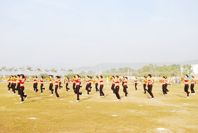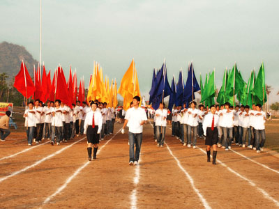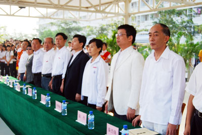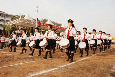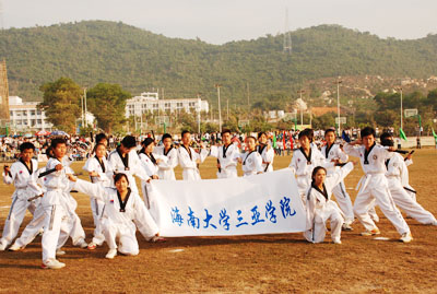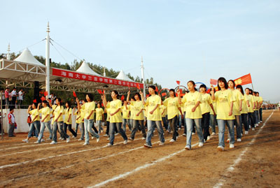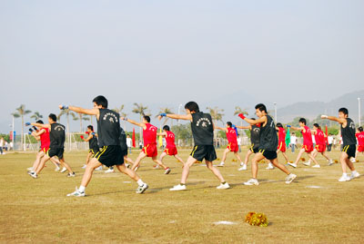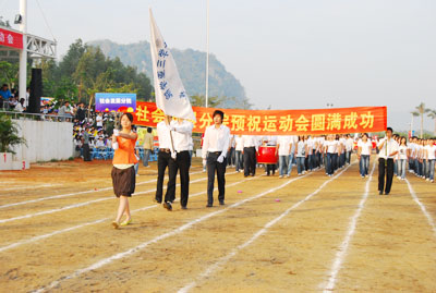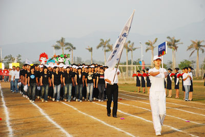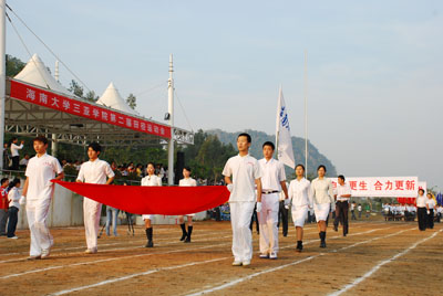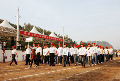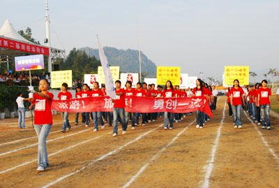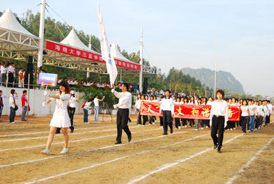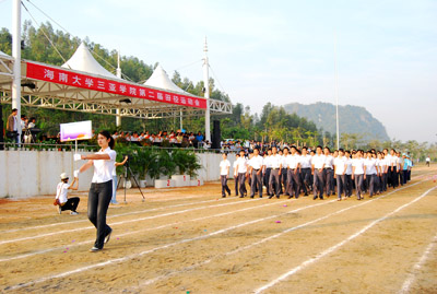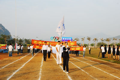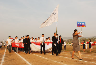机关代表队方阵 伴随着庄严的国歌声,鲜艳的五星红旗冉冉升起,学院副院长秦杰锋教授致开幕词。他指出,第二届田径运动会的举行是学院全面贯彻党的教育方针,全面实施素质教育,努力培养德、智、体、美全面发展的社会主义建设者和接班人的具体体现,是弘扬“更高、更快、更强”体育精神的重要平台,是紧贴学院“311”课程体系,塑造健康人格,锻炼五种能力的重要举措,是推动群众性体育活动开展的又一载体,是响应教育部提出的 “每天锻炼一小时,健康工作五十年,幸福生活一辈子”的要求的措施。他希望大家以饱满的热情、昂扬的斗志、勇于拼搏的信念和团结向上的协作精神投入到本次盛会中去,赛出风格、赛出水平,共同参与,共享盛会,共同为自己的青春与风采喝彩。 随后裁判员代表,运动员代表分别宣誓,他们都以坚强的决心表示,在本次运动会中,他们会各尽所能,体现出“更高、更快、更强”的奥林匹克精神,弘扬体育道德风尚,赛出成绩、赛出风格、赛出水平。 上午八时许,学院党委书记、执行院长陆丹教授庄严宣布:“海南大学三亚学院第二届田径运动会开幕。”双截棍表演,优美的健美操,武术表演把开幕式推向高潮,独特新颖的表演更有“沙场秋点兵”的铮铮誓言,一次次地引起了全场的惊叹、欢呼。