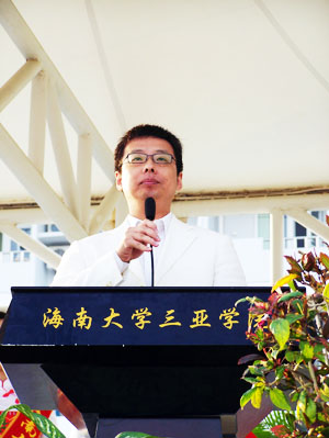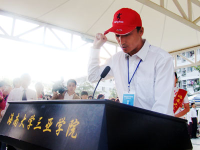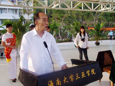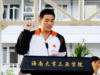 运动员代表宣誓 繁花吐艳,绿树成荫,冬日的海南大学三亚学院依然春意盎然。彩旗飘飘,鼓声阵阵,神奇的落笔峰下一片欢歌笑语。12月29日上午,在三亚学院全体师生热切地期盼中,学院第二届田径运动会在田径场隆重开幕。学院党委书记、执行院长陆丹教授等学院及各分院、部门领导出席了开幕式。开幕式由学生处处长邹兴海主持。 上午八点,田径运动会在催人奋进的《运动会进行曲》中拉开帷幕。全院8000多名师生组成的11支方队喊着响亮的口号,迈着矫健的步伐,斗志昂扬地向主席台走来,展现出他们团结一致、顽强拼搏的精神风貌。 首先入场的是由国旗队、校旗队、校训牌、彩旗队、军鼓队、鲜花队组成的前导队,他们面带笑容,充满着青春的活力,成为一道独特的亮丽风景。