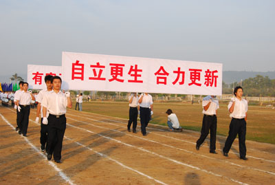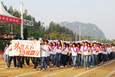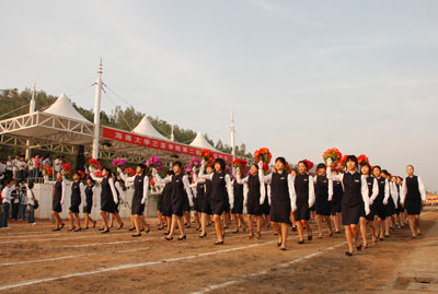 理工分院方阵 旅业管理分院代表队打出“同一个世界,同一个梦想”的标语牌,托起奥运五环,以“旅游,旅游,争创一流”为奋斗目标,带着鲜花般的笑容,以崭新的面貌入场。