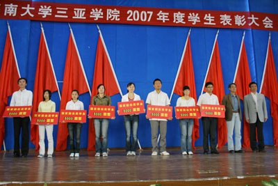 学院领导与奖学金获得者合影2008年1月6日下午,学院千人礼堂洋溢着节日的喜悦,学院隆重召开2007年学生表彰奖励大会,对获得国家奖学金、国家励志奖学金、三好学生、学院奖学金等千余名学生进行了表彰。院党委书记、执行院长陆丹教授,院长沈为平教授等学院、部门和分院领导出席表彰奖励大会并为获奖同学颁奖。大会由院党委牟维莲副书记主持。 在庄严的国歌声中,表彰奖励大会拉开帷幕。沈为平院长向大会宣读了国家奖学金、国家励志奖学金名单。学生处副处长顾斌宣读了关于表彰《国家奖学金、国家励志奖学金及学院2006—2007学年三好学生及各项学生奖学金》的决定。 院党委书记、执行院长陆丹教授致开幕辞,他首先代表学院向获奖的同学表示祝贺,并转达了吉利集团董事长李书福先生对全院师生及家人的新年祝福。他说,同学们是幸运的,大家生活在一个好时代,现代化全球化的浪潮使政府和人民更加重视人才的教育,根据党的十七大既定方针,政府加大了对高校的投入,同学们也得到了国家办颁发的奖、助学金。 三亚学院是在党的科学发展观指导下,在国家实现教育大众化的背景下,在省委省政府“办一所海南有规模有特色大学”的要求下,在教育部明确规范办学、提高质量、注重改革创新的客观前提下应运而生的高校。三亚学院从诞生之日起,就把“让学生更好地走向社会”作为自己不可动摇的使命,现在乃至未来,三亚学院亦将始终将培养学生作为自己最重要的目标。在这个目标下,学院对教学计划的实施很严格、对教师考核很严格、同样对同学们的要求也很严格,同学们的出类拔萃,值得为大家提前感到骄傲。 最后,陆院长请全体同学们坚信,并请全体同学向家长们转达学院的意志:三亚学院今天的工作与努力,在理念上、机制上、人才培养模式上、课程教学上、管理方式上,都旨在向一个更能与教育国际化接轨的现代大学制度靠拢。其靠拢的唯一使命就是:让学生更好地走上社会,更好地成才,更好地走向成功! 接着,学院领导依次为各类获奖的同学颁奖,台下不断响起雷鸣般的掌声。人文与传播分院文秘0501班郝凤林同学代表获奖学生作了充满激情的发言,她表示将再接再厉,用实际行动回报学院和国家。 最后,党委副书记牟维莲老师作了总结发言,她首先对获奖的同学表示祝贺,指出评选各类奖学金和召开本次表彰大会的重要意义,号召同学们以获奖同学为榜样并继续努力,希望获奖同学戒骄戒躁、争取更大进步。 今天是一个喜庆的日子,更是一个令人振奋的日子,这次表彰大会的召开将激励更多的同学为实现“走进校园的目的是为了更好地走向社会”这一育人理念而努力奋斗。 编辑:安娜 文:院记者团 周嵩�病∩阌埃褐茉品� 刘玉峰 丁磊