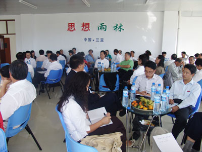 培训会现场围着茶几、吃着水果,本学期最后一次干部培训1月19日下午在图书馆三楼思想雨林活动室拉开了序幕。 与暑期培训不同,这一次的培训从物资供应处牟暄老师讲《明史》开始,引发了一场关于历史、文化、宗教、信仰的大讨论。大家从各自不同的学科背景出发,自由表达自己的观点,现场气氛十分活跃。 讨论结束后,院党委书记、执行院长陆丹教授对大家的发言一一做了点评,并鼓励大家多关心社会热点问题,多关心学生关心的问题,多思考专业以外的问题。一个大学里的职业化团队,应该有很多对大学、对人生、对专业的看法可以探讨。讨论历史的目的是为了以史为鉴,但不能在历史的窠臼中驻足不前,要跳出误区,要看到中国社会在社会主义市场经济形势下,正在探索着良好的发展道路及方法,进行全新的探讨。学院的执行文化已经取得了一些成绩,讨论文化还有待进一步展开,在弘扬讨论文化的同时需要大家保持理性、客观。 陆院长说,学院2008年发展将上一个新的台阶,“万人大学”的目标即将实现。出资人李书福先生一直希望能把三亚学院办成一所很好的大学,我们的老师要能面对社会的发展和需求,要使学生的培养能跟上社会发展的步伐。今年暑期培训已经使干部队伍的职业化素养有了很大改观,但这个目标并没有完成,伴随着新形势的到来,同志们不能懈怠。 广大干部也纷纷表示,将时刻谨记学院“有容乃大、不懈则优”校训,组织间互相包容、互相理解,时刻保持创业时的激情的自信,坚持职业化建设,杜绝集体平庸。