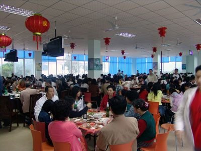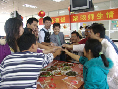 年夜饭现场二2月6日是农历大年三十,北二食堂张灯结彩,不时传出欢快的乐曲,“温馨年夜饭浓浓师生情”的条幅挂在入门显眼处,传递着新春佳节的讯息。 下午5点半,在学院过年的全体师生600多人已齐聚在二楼食堂,准备享用学院为留校过节师生准备温馨的年夜饭。院党委副书记牟维莲同志代表学院感谢大家一年来对学院工作的支持,并祝大家春节快乐,希望老师们在新的一年里工作顺利,身体健康;希望同学们学习进步,取得更好的成绩! 伴随着祝福平安的鞭炮声,年夜饭正式开始,丰盛的年菜摆满一桌,师生们围坐桌旁,共吃团圆饭,互谈新年愿望,其乐融融。