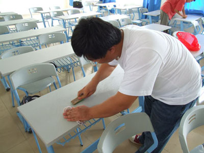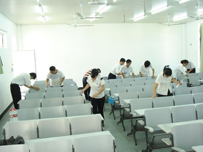 同学们在清理课桌文化(二)编者按:自鲁迅先生在桌上刻下一个“早”字开始,“课桌文化”便悄然流行,抒情、铭志、宣泄……整洁的课桌在这样一次次的“创作”中变脏。作为新时代具有责任感和公德心的大学生,“爱护美丽校园,关注每一个细节”让他们行动起来,他们用自己的行动向大家宣誓:“即使没有‘早’字,鲁迅先生也不会迟到!” 三月春风吹遍大地,带来了春的惬意,同时也唤起了社会发展分院同学向雷锋同志学习的热情。3月16日15时,社会发展分院团委成员、学生会成员,各班班长、团支书,预备党员及入党积极分子准时在书明楼d202教室集合,在辅导员王翔老师、刘宇航老师带领下,向书明楼d栋校园顽疾“课桌文化”这一不文明现象宣战,社会发展分院“美丽行动”之青年志愿者服务——清除“课桌文化”活动拉开帷幕。 据悉,社会发展分院团委为发扬雷锋精神,在构建和谐校园的旗帜下,积极倡议分院同学向校园顽疾“课桌文化”这一不文明现象宣战,用美丽行动为全院同学营造一个文明幽雅的学习环境,以实际行动向学习雷锋月献礼。第一期以班级为单位的清除“课桌文化“活动得到分院同学积极响应,此次活动为第二期。 社会发展分院党总支万志全副书记在活动开始前作了重要讲话,指出开展这一活动的重大意义,号召大家认真负责的做好这一工作,还课桌一个“清白”。 说干就干,各位学生干部明确分工,互帮互助,带着事先准备好的洗衣粉、刷子、拖把、水桶、抹布等工具杀向书明楼d栋15间多媒体教室,一场“课桌文化”歼灭战精彩上演。同学们沾着洗衣粉,耐心的用刷子清洗着课桌上留下的“文化”,有些“敌人”很顽固,拒不“投降”,但聪明的同学们采用灵活机智的战术,结合第一期工作经验 “对症下药”,最终把他们全部制服。17点左右,15个“战场”先后告捷。看着洁净的课桌,清新的教室,同学们别提有多高兴。 更重要的是,同学们在“战斗”的过程中,在思想上受到了一次深刻的教育和洗礼。在社会发展分院团委的倡议下,在学院团委和学生处的指导下,一场全院性质的“课桌文化”歼灭战即将全面展开,一个清新美丽、文明和谐的校园将呈现在全院同学面前。 bye-bye,“课桌文化,还课桌一个“清白”! (编辑:陈莎莎)