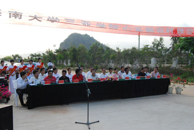 三亚市政府副秘书长吴海玉、田独镇镇长李骥及三亚市教育局副局长陈晋玲、司法局副局长王明才在典礼上致辞,受支教小学领导出席了仪式。学院院长办公室主任赵楠主持了仪式。 作为同处于落笔洞景区的邻居,学校一直将支持周边地区建设,带动共同发展视为己任。学院鸣鹰支教队从2006年起就一直对红花小学开展义务支教活动,2007年3月又增加了红庄和罗蓬两所小学。支教队每周三下午对这三所小学进行支教,人文与传播分院教师为其指导。除了为孩子们讲授语文、数学、美术、音乐等原有课程之