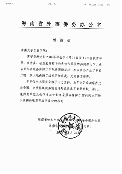 日前,学院收到2008博鳌亚洲论坛年会领导小组办公室和海南省侨务办公室发来的感谢信,感谢学院为2008博鳌亚洲论坛做出的贡献。