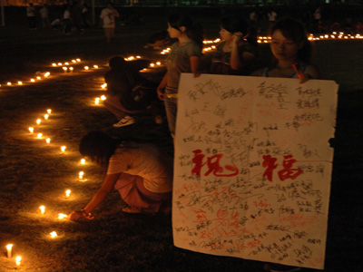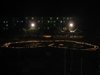 2008年5月20日晚,烛光照亮了学校的足球场,学院的千名师生自发来到足球场上,排成心形的队伍,手捧蜡烛,集体默哀。此时,没有人的心不悲痛。5月12日,汶川地震,历史铭记中国的悲伤,国旗半降,汽笛长鸣,山河齐哀,举国同悲。虽然身在天涯海角,但我们与灾区人民的心是连在一起的,今天我们以这种方式,对地震遇难同胞深切哀悼,为幸存者祈福。愿逝者一路走好,生者加油!
