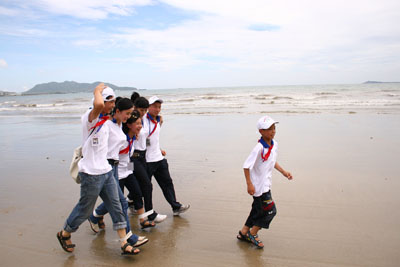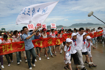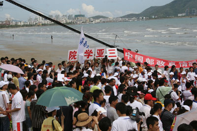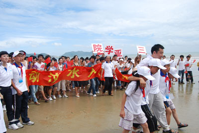 活动现场(四)2008年6月3日下午14:30,三亚湾阳光明媚、人头篡动。海南大学三亚学院100多名志愿者参加了“为了灾区的孩子——爱心呵护、阳光行动”活动。 作为志愿者的同学早早准备好了有趣的游戏和精美的礼物,想将自己的一份真情与爱心献给这些孩子,从而帮助他们打开心门,走出悲伤。 下午三点,活动正式开始,在明星和现场来自灾区的儿童接力跑游戏过后,三亚学院的同学来到孩子们身边,或拿出准备已久的礼物,或用亲切的话语安慰,或与孩子们游戏拍照。心与心的交流,情与情的传递,同学们用一颗颗年轻而炽热的心温暖着在场每一个孩子的心灵。活动结束的时候,孩子们微笑着挥手致意,看着他们渐渐远去的身影,同学们久久不肯离开。 地震无情人有情,让我们大手牵小手,传递爱心,传递真情,重塑起孩子们生活的信念,勇敢地面对充满希望的人生。