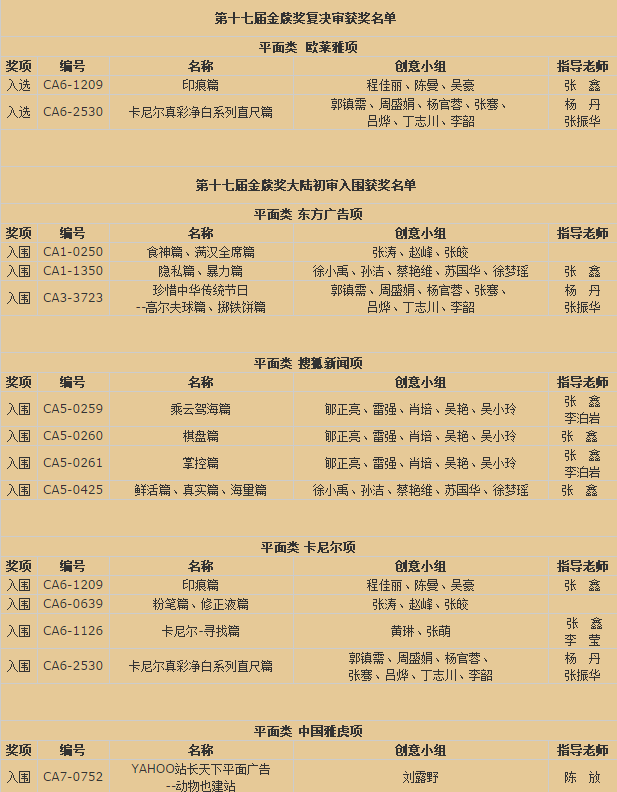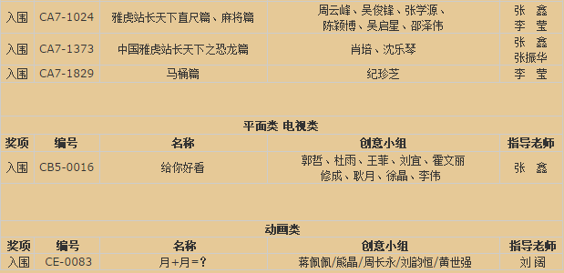 第十七届时报金犊奖在台北和北京历经了两天两夜的初审和复决审,在两岸三地15位评审严格和紧张的作业下,于2008年5月14日在北京揭晓。我院艺术分院有十八件参赛作品脱颖而出,取得优异成绩。参赛获奖作品如下: