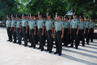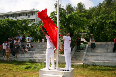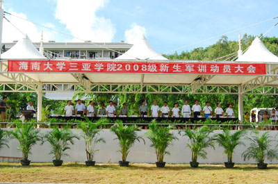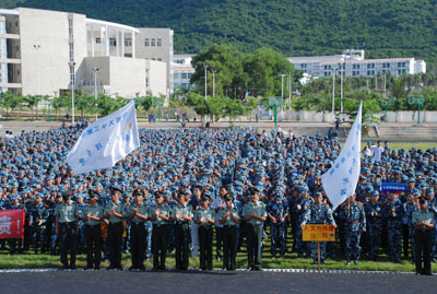升旗仪式9月5日上午9时,来自全国三十个省市自治区的4000余名新生身着整齐的迷彩服列队参加了2008级新生军训动员大会,为期15天的新生军训正式拉开帷幕。 学院副院长秦杰锋,党委副书记牟维莲,学生处、教务处、招生就业处、各分院主要负责人及三亚警备区海防营领导参加了此次动员大会。会议由教务处处长孙仁佳主持。 伴随着雄壮的国歌声,五星红旗冉冉升起,新生军训动员大会正式开始。学院对全体08级新生的到来表示热烈的欢迎。军训是大学生活的第一课,希望同学们能发扬不怕苦不怕累的精神,团结互助,服从命令、听从指挥,通过军训学习艰苦奋斗、严守纪律的优良传统和作风,学习国防知识和军事基本队列规范,增强自己的国防意识,培养良好的集体观念,练就吃苦耐劳、勇于进取的坚强意志。他希望同学们能够通过军训更为清楚的认识自己,认识他人,了解团队,明确责任,从而深刻体会学院“豪气、大气、正气”校风和“自立更生、合力更新、有容乃大、不懈则优”校训的含义。 最后学生处处长顾斌对新生军训作了具体的部署,并从着装和纪律等方面提出要求和希望。随后,在教官的带领下各分院以班级为单位进行训练。 据悉,本次军训教官由三亚警备区海防营战士担任,在为期15天的军事训练中,同学们除了学习中国人民解放军队列、纪律和内务三大条令,进行队列动作、队列队形、队列指挥和队列训练外,还将进行自我认识及团队行动拓展训练。 (袁杏玺 彭世旭 薄飞宇 李亚光)