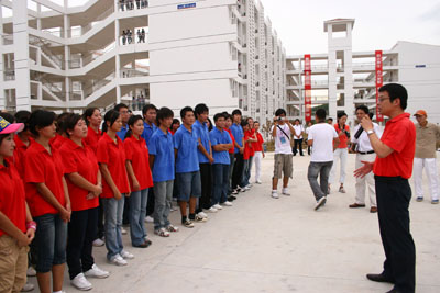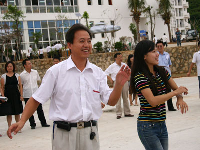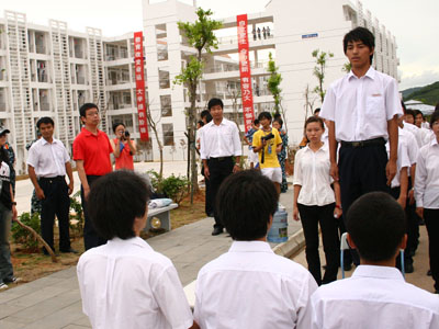 陆丹院长在现场 9月12日下午,院党委书记、执行院长陆丹,院党委副书记牟维莲及学院全体中层干部一起来到西区,参观“我是谁”和“我和你”健康人格拓展训练。 西区校道上一个一个的小方阵中,每一个人都表情严肃。训导员连珠炮似的提问,受训者毫不犹豫地回答,不少人的白色衬衣被汗水濡湿,但每一次出列、归队、答问依然步伐坚定、声音洪亮。这是大部分新生已经感受过的“我是谁”拓展训练环节。 球场上,穿红蓝两色体恤的男生女生伴随着轻松欢快的音乐列队跳舞,相比起严肃紧张的“我是谁”,“我和你”这个环节就显得轻松很多,每个人都兴高采烈,脸上漾着灿烂的笑容。不少领导在学生的邀请下也加入了集体舞蹈的行列。 在现场参与训练的06级同学说,今年的新生军训让他们感觉到“不可思议”,但是确实让人感觉很棒!她很快认同了这两个活动,也希望新生能理解学院的良苦用心,她期待着去教新生们跳“我和你”的时候。 在场外参观的08新生则说,常规的军事训练让他们得到了国防教育、了解了军事知识。而健康人格拓展训练则让他们眼界大开,常常迫不及待地告诉高中时的朋友最新的体会,“这绝对是让人想象不到的军训。” 陆丹院长在训练场上告诉同学们,教育是一个国家送给国民最好的礼物。三亚学院要送给大家的最好的礼物将是——健康的人格。对于一个人来说,知识是认识社会的需要,能力用来解决问题,而健康的人格决定一个人的生涯发展。所以,学院特别策划在08级新生军训中加入健康人格拓展训练活动,就是为了让同学们能够认识自己、转变角色、融入团队。在“我是谁”活动中感受到规则、层级的概念、在“你和我”活动中感受到平等和友好。 (陈莎莎 李亚光)