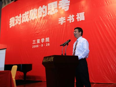 李书福董事长作报告 9月26日16:30,三亚学院出资人、吉利集团董事长李书福先生在书德楼报告厅与全院师生共同分享了他对成败的思考。 报告会由院党委书记、执行院长陆丹教授主持,陆院长首先引用温家宝总理的话“中国改革造就了一批企业家,企业家回馈社会的最好方式是办教育”向为三亚学院出资的李书福先生表示了感谢。陆院长说,三年多来三亚学院不断地引起世人瞩目,很多专家问过为什么三亚学院在全国326所独立学院中能走在前面,能创造诸多的发展奇迹。在这个问题上,三亚学院的办学思想和国家期望是高度一致的:“要办人民满意的教育”就是要让学生受社会欢迎,有社会责任担当,能更好地走向社会。在实现这个目标的过程中,每一个关键点都留下了李书福先生的智慧。 报告会上,李书福先生简要介绍了三亚学院诞生的经过,并由此展开他本人在事业成功上的成败思考。李书福先生说,成功的定义是非常广泛的,个人的成功必须建立在集体成功的基础上,集体成功依赖于国家成功,而国家成功的先决条件在于整个中华民族的成功。在三亚学院的建设事业上,吉利既有为自己的企业培养人才的需要,更有为社会做一点贡献的想法。考生的分数并不能代表个人智商,更不代表其人生的失败,学生不能适应当前高等教育体系而导致的应试失败现象应加以改观,而如何对中国高等教育改革提供一些实践的经验,摸索出一条值得借鉴的中国高教改革之路,三亚学院要敢为人先。 面对三亚学院万人规模大学的现状,李书福先生称:“世界上没有什么事情是绝对不可能的,只要有心、用心,一定能取得成功。在万人大学发展阶段,对新情况新问题要有不同的认识层次和不同的解决办法。只要人人都做有心人,三亚学院的规模必将进一步扩大,创造更辉煌的成果。” 李书福先生还向大家介绍了吉利集团的企业战略、企业文化和企业精神,重点解释了吉利“以人为本、从严治校”的教育理念。 最后,李书福先生用他的成败相对论结束了报告,全场报以热烈的掌声,报告会取得圆满成功。 会后,大学生记者团采访了李书福先生。在采访中,李书福先生回忆起几天前出席的学院万人大学开学典礼感慨颇多。他说,开学典礼上三亚学院师生奋发向上的精神面貌让他的心情十分激动。三亚学院经过短短三年多时间的发展,突破万人规模让他感到十分欣慰,这样的成绩为吉利继续推动三亚学院的发展增添了信心。最后,李书福先生还向全院师生表达了温馨的祝福:祝愿同学们学业有成,快乐成长,拥有一个美好的前程;祝愿老师们工作顺利,生活愉快,在教学相长中不断努力、不断进步。 (刘元林 李相翠 吴启星 彭世旭 周云峰)