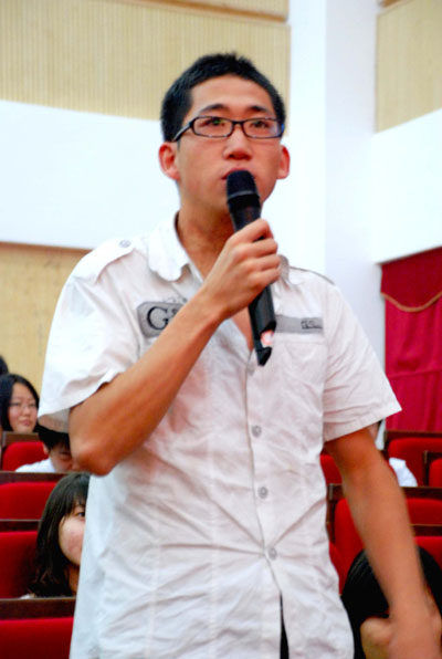 学生现场提问 晚7时30分,报告会正式开始。刘教授首先以黑格尔的哲学为引阐释本次报告会的思路,随后为同学们解释 “人”的含义,深入阐述科学认识对“人”的定义以及“人”的发展的层次性。在谈到认识自我时他说,人是自我意识与理性的觉醒,同时还要大家明确人具有双重生活与双重生命的特性。并点明只有做到“我为人人”才能得以创造和谐社会的主旨思想,全场师生报以热烈掌声。在这过程中刘教授不仅举用了大量的名人事例同时还穿插了他所拍摄的见闻图片进行讲解。刘教授最后指出,人类需要大智慧,需要人文精神,科学的风暴或许会把世界变成荒漠,人文之花则如绿洲般给万物以长久的滋润。 现场提问时间,在场学生踊跃参与,向刘啸霆教授提出了许多关于人文精神解读的问题,刘教授都作了详细解答,并且留下邮箱以便大家更多的交流。 (詹利丽 杜珍珍 徐任弘)