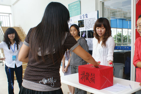 小小捐款箱 传递点点真情 在汶川大地震带来的伤痛还没有完全复原时,华夏大地再一次遭受了突如其来的灾难。4.14玉树地震将国人的心再次深深地牵动起来,远在天涯海角的三亚学院师生也情系灾区人民,通过降半旗默哀、烛光祈福、献血、募捐、主动交纳特殊党费等多种形式表达着对玉树人民的祝愿.。 4月21日晚七点整,在学院北三灯光球场首先聚集了数百名自发前来为灾区人民募捐的阳光学子。同学们以班为单位,围着用蜡烛编成的写着4.14的心,整齐有序的排着队,心中默默为地震灾区人民祈福。本次活动由旅游管理分院和艺术分院联合主办,并邀请三亚市红十字会协助参加。希望通过默哀与募捐的方式将我院芊芊学子的关心与祝福献给坚强而勇敢地玉树人民,愿我们的同胞们早日从伤痛中走出来,重建美好的家园。 4月21日晚8时许,学院北三田径场又出现了一个闪亮的心,他们是由来自青海的学子自发组织的为家乡人民祈福。 “站起来,我的爱连着山脉……站起来,我的爱拥抱大海……”有力的歌声中,又有许多同学自发走到台前,把一张张写满祝福的小纸条连同他们的捐款放入募捐箱。 4月22日上午11时,在学院交流中心,学院党委书记、执行院长陆丹和其他院领导一起,为玉树地区默哀,随后,他们逐一为玉树地区捐款及交纳特殊党费,用这样的方式为玉树人民献上自己的爱心。当日,学院交流中心的募捐箱前,不时有老师前来交纳特殊党费及自发捐款。 4月22日至23日,学院东区、北区、西区的几个食堂门口,也不断地有阳光学子们为玉树地区捐款。大家都用自己的实际行动为玉树地区表达着真诚的爱心。 经4月27日最后统计汇总,学院师生交纳特殊党费四万三千余元,捐款一万一千余元。 在灾难面前,师生用行动诠释了爱与责任的全部意义。 (供稿:大学生记者团)