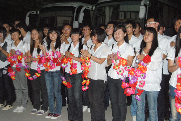 师生们手执花环,等待“凤凰礼仪”回家