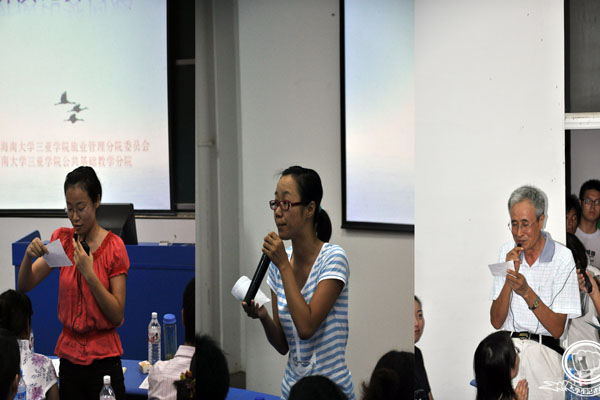 老师点评 为进一步营造学院英语学习氛围,丰富校园文化、推动学院学风建设,给大一学生提供展现英语风采的舞台。5月20日晚8点,由旅业管理分院主办的英语主题的演讲比赛在书德楼阶梯教室举行。演讲主题是“my freshman life at sanya college”(我在三亚学院的新生生活)。比赛一改往常单一形式的演讲形式,拓展为综合口语表达、表演、团队合作以及应变能力的全面展示方法进行。 比赛分三个环节。首先由选手自由展示,然后再对抽取的问题进行回答,最后由评委现场评分。第一位出场的是人文分院徐金雍、朱成峰两位同学,他们从入校后耳闻目睹的一些趣事入手,以自己身边人和事为主体,凭借出色的口语以及绘声绘色的表达让全场进入活跃气氛。接着出场的是公共基础分院,他们以采访的表演方式,从军训到第一次参加社团活动,从离开父母的身边到与周围同学的相处展开演讲,还用图片展示了三亚学院的美丽风景,和同学们在大学的一些生活细节,让在场的同学们感同身受。接着出场的艺术分院更是挥舞着球拍,穿着迷彩服上场,载歌载舞,把全场气氛带上高潮。随后,旅业管理分院在机智问答环节有条不紊的口语表达赢得了现场师生的热烈掌声,管理、社发、财经、理工、法学等分院的阳光学子们也通过各种各种的渠道充分的展现了他们的创作才能和优异的英语水平,比赛中欢呼声、喝彩声、欢笑声不断。 经过两个小时激烈的角逐,公共基础分院与旅业分院并列获得第一。公共基础分院潘钧院长用英文向同学们致以问候与祝福,比赛在一片欢呼声中落幕。 赛后,许多参加比赛的同学表示,从这次比赛的参与准备过程中,在学到很多知识的同时更锻炼了自己对生活的观察能力,也增进了对学院、对大学生活的了解和热爱,通过这样的活动,自己学习英语的热情更加高涨,沟通、表达、交流的能力也得到了锻炼。而更多的台下观众则认为,这样的活动给他们又打开了一扇学习英语的兴趣之窗,在学院丰富多彩的英语活动和竞赛过程中,让学习快乐起来,让比赛活起来,让心情high起来,从这样的活动中深切体会到了学院“愉快学习、自主成长”定义。 (供稿:大学生记者团)(文字:隋媛媛 编辑:姬晓宇 摄影:李迪)