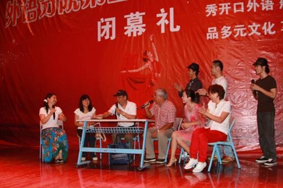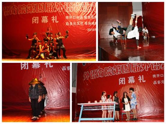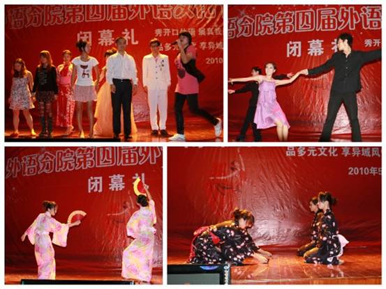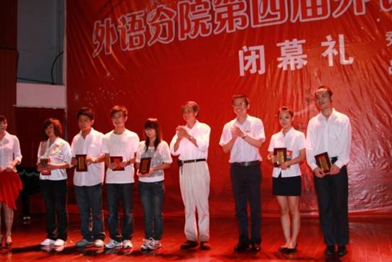 陆丹院长、沈为平院长为获奖者颁奖 5月25日晚19:30,外语分院第四届外语文化节闭幕礼在书德楼报告厅隆重举行,宣告历时近一个月的外语文化节正式落下帷幕。学院党委书记、执行院长陆丹,院长沈为平、副院长秦杰锋等学院领导及外语分院师生出席了文化节闭幕晚会。 闭幕晚会开始,外语分院院长汪士彬教授对本届文化节致闭幕词并宣布外语分院第四届外语文化节胜利闭幕。外语分院英语0901班安彬同学作为学生代表表达了同学们文化节的收获和感受。闭幕晚会中,三个专业的师生们为闭幕晚会准备了精彩纷呈的节目,受到了与会领导、嘉宾和师生的一致好评。 以“秀开口外语 展真我风采 品多元文化 享异域风情”为主题的第四节外语文化节,面向英、日、俄三个专业展开,主要开展了词汇综合竞赛、演讲、歌舞、电影展播、短话剧表演、异域文化展等活动,5月5日开幕,5月25日闭幕,整个文化节持续3周。通过参与文化节的各项活动,同学们提高了外语应用能力,开阔了视野,增强了文化和艺术修养,培养了良好的团队协作精神,充分展示了莘莘学子朝气蓬勃的精神风貌和青春风采。教职工们在活动中,主动积极、精心组织,使得各项活动顺利开展,进一步加强了团队凝聚力和荣誉感。外语文化节是学院校园文化建设的重要活动之一,以培育外语环境,营造学习氛围为主要途径,培养师生“开口说外语”的兴趣和习惯,让学生在活动中不断加强口语训练,加强外语综合应用能力的培养,全面发展,真正成为合格的应用型、实用性的外语复合型人才。
