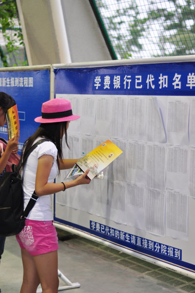 来到风雨球场,新生报到现场。学长说,学校为了锻炼我们的独立,报到过程由自己独立完成,先查一下我的名字在不在这里。
