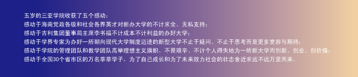 “独上江亭望帝京,飞鸟犹需半年程。”1000多年前,唐朝宰相李德裕在流放三亚之时,曾经写下了这样的诗句,述说天涯海角的浩淼杳远。直到今天,不仅仅是三亚乃至整个海南岛,文化积累和北方相比仍显单薄。作为三亚市的第一所本科院校,三亚学院的创办开启了三亚城市现代化一支重要文脉,夯实着三亚的城市精神,探究着三亚的城市智慧,有力地铸就着三亚的城市形象,书写独属三亚的文化史、文明史,让文明之花在这个海岛枝繁叶茂。 铸就城市智慧,发端地方智库,三亚学院的创办,绝不仅仅是建起美丽的校园、每年培养数千名学子,更是在为中国这个唯一的热带滨海旅游城市三亚写下深刻的当代史。自三亚学院创办之后,学院就发起了“三亚大讲堂”,遍请省内外的诸多名家莅临三亚、开堂讲座,成为学子和市民的精神家园。定时举行的“思想雨林”,采用“面对面”的形式,思想名家、学院学子、学院教师,都可以讲出自己的观点和想法,其“论道”之精神和形式,让每一个参与者如沐春风。 科研是大学的功能,社会服务是大学的功能,首善之区也是大学的功能,文化高地还是大学的功能。纵观大学的发展史,三亚学院提出“是什么使得大学称之为大学”的问题,最后大家认识到:尽管科学研究是大学能称其为好大学的最重要的理由之一,但是更为基础的功能或者兴办大学的原点却不是科研,而是因为培养高级人才,大学才称其为大学。而在三亚这个地方育人,则是为三亚发展的百年大计厚积薄发。 从无到有、从小到大、从外延而内涵,三亚学院的发展规律是一个大学起步办学必经的过程,其辛苦是一个无数人流汗、流泪、流心血的过程,其成效是一个不断创造奇迹激动人心的过程。如今的三亚学院,有同类院校中全国最大的招生规模,有最大最美丽的校园,有最多最新的校舍,有最多全职的师资,有成长最快的各类排名。首届专科毕业生实现100%就业,首届本科毕业生一次性就业率98%,还有多项在海南高等院校中的诸多第一:社会发展分院、法学分院的首届毕业生研究生考取率分别达10%,艺术分院学生在全球华人“金犊奖”大赛获得海南赛区第一,经管分院在校生初级、中级会计师考级通过率为海南第一,理工分院在电子设计大赛中取得一等奖获海南第一,人文分院学生在播音主持大赛获海南第一等等,还有如诗朗诵、国标舞、电影制作、软件设计等项目更直接在全国大赛中捧回全国总冠军…… “不积跬步,无以至千里;不积小流,无以至江海。”三亚学院,从来没有沉迷于大学作为一个组织大小的物理空间变化,而是更醉心于不断完成着一个大学内涵品质提升的积累。从办学的精神到办学的制度再到办学的文化,学院不断探索不断丰富着一所好大学理想形态所需的基本要素。同时,三亚学院尊重大学自身运行的特殊规律,重视大学作为社会诸多设置之一其所具备的社会一般规则,力图理解现代大学历史发展所呈现的内在肌理和脉络,最后实现大学自身的发展。 借助战略管理的智慧,三亚学院完成了从大学使命到大学的目标、定位、结构、队伍、品质、特色等一系列要素系统地、动态地把握,从而促使学校有了快速完整、高效增长、高位提升、持续动力、永续发展所必要的体制机制,并且得以“结构定型、目标定位、文化定味、品质定性”。五年来,三亚学院上下戮力同心,努力造就一支为培养学生能更好走向社会的“志业、敬业、专业、乐业”的职业化教学与管理的团队,并且一直努力促使团队保持高昂的斗志。 今年6月8日,海南省委常委、组织部长楼阳生在三亚学院调研时指出,三亚学院在艰苦的环境下起步,五年发展到如今的水平,承继了出资人李书福“浙商精神”中不服输、“别人冬眠,浙商冬泳”、善于从困难中找到机遇的优良品质。楼阳生热情勉励三亚学院乘势而上,成为“三冠大学”:教育理念之冠、体制文化创新之冠、实用性人才培养之冠。楼阳生说:要办好大学,要有大师、高师、名师。同时,大学最终要以学生立足,做老师必须要以学生的成长、成才为追求与荣耀,相信三亚学院通过努力,在办学团队的领导和地方党委与政府的支持下,一定能够做到“三冠大学”,