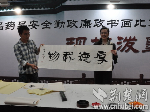 陈才俊的获奖作品 据了解,此次书画比赛活动由湖北省药监局、新华社及湖北日报传媒集团共同主办,以“扬清风正气,保食品药品安全,促社会和谐进步”为主题,从8月初启动到9月中旬结束,历时一个多月,先后有900多人向组委会投稿,参赛作品1000余幅,其中包括200多位国家级和省级书画名家的作品。参赛人员年龄跨度大,最大的有八旬以上,陈才俊是此次参赛年龄最小的选手。 10月12日,书画大赛颁奖仪式在湖北省楚天传媒大厦隆重举行,众多书画名家和大赛获奖选手当场挥毫献艺。 在泼墨现场,一位身着格子衬衣的年轻人格外引人注目,他就是陈才俊,我院艺术分院环境艺术设计专业大三学生,最年轻的参赛选手,一等奖获得者。