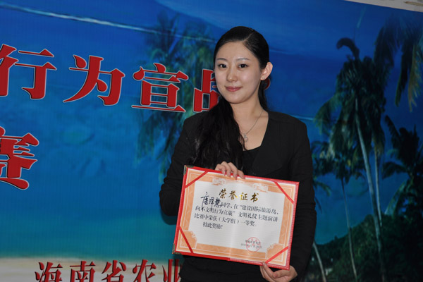 记者从刚刚结束的由海南省教育厅举办的“建设国际旅游岛,向不文明行为宣战”的大型文明礼仪演讲比赛活动中获悉,我校学子唐泽慧同学凭借出色表现,从众多参赛者中脱颖而出,荣获大学生组一等奖。