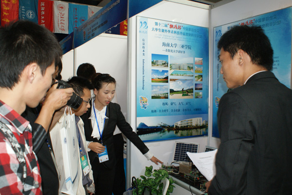 参展会上向各高校学子介绍科技作品设计原理与应用价值 接到全国挑战杯组委会的通知是在今年9月,第十二届“挑战杯”全国大学生课外学术科技作品竞赛的决赛是在大连理工大学举行,《基于无线传感网的智能灌溉与报警系统》这一作品进入终审决赛。“接到通知时,我们几个开心的在实验室里相互拥抱。第一时间把这个好消息告诉了吕振肃老师和杨志民老师,老师不断鼓励我们,说要继续夯实作品的实用价值基础,让系统构架再清晰一些,并针对控制终端加强构建,提升整体的科技含量。”在谈到当时接到全国终审决赛的通知时,苏玮依旧抑制不住内心的兴奋。 在赛前的一个月时间里,他们每天都泡在实验室。继续在作品设计上下功夫,并在原来的基础上增加了无线传感网和gsm网络搜集以及控制各个节点工作状态的装置,根据需要选择不同的控制终端。作品以绿色能源为理念,在使用的过程中由太阳能供电,符合海南绿色低碳岛的建设需求。 “当这一科技作品在我们的努力下,第一次投入小批量生产使用成为了产品时,我们对它的前景又作了更详细的规划。”看着作品在四个人的手中一步步成熟,苏玮和同伴们很开心,“累点没关系,能够取得好成绩我们付出的所有努力都是值得的。”