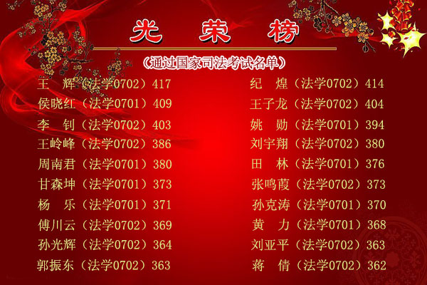 法学院2011年考研光荣榜 法学院注重教学与学生培养的科学结合,逐步摸索出一条富有特色的学生培养之道,以教学促“三考”,以“三考”促就业。在教学计划的设计和制定中,通过科学合理的课程设置,加强应用性和实用型的课程比例,在教学中适量增加与“三考”相关的课程,以提高学生的学习积极性和就业主动性,最终达到以教学促“三考”,以“三考”促就业的目的。“三考”即国家司法考试、国家及地方公务员考试、国家研究生考试,在已毕业的学生中通过国家司法考试的有133人,进入各级党政机关的公务员80多人,70余名同学在国内外著名高校进行研究生学习和深造。