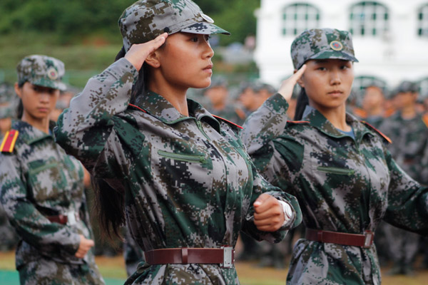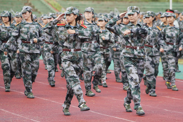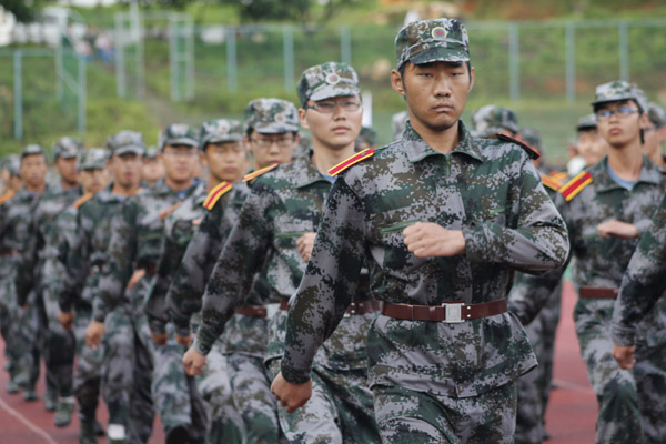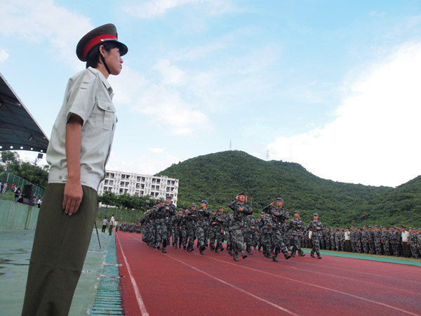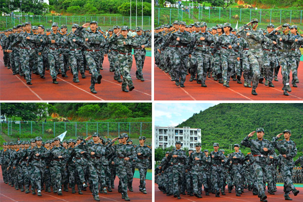 经过严格军事训练的2012届新生们整齐列队,接受学校检阅