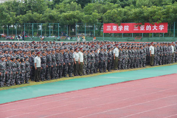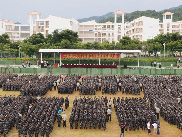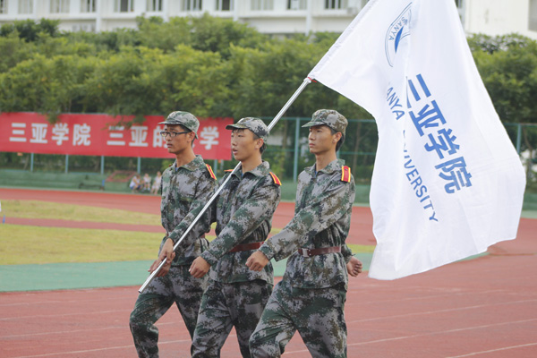 刻苦训练出成果,活力激情新风貌。9月14日下午,三亚学院2012级新生军训总结暨阅兵大会在我校北区田径场隆重举行。校领导王勋铭、沈建勇以及各学院领导、老师出席大会;全体参训新生参加,接受学校检阅。本次大会由教务长江合宁主持。 大会在庄严的升国旗、奏国歌仪式中开始,全场参会领导、教师和学生专注地看着国旗升至最高点。随后,三名旗手举着校旗踏着整齐的正步从主席台前走过,开始阅兵仪式。 新生们经过10天军训,终于迎来了期待已久的精彩亮相时刻。当每个方阵走过主席台时,“自立更生、合力更新、有容乃大、不懈则优”的校训都会响彻全场。踏着整齐坚定的步伐,新生们昂首挺胸地走过主席台,阅兵前的大雨让场内略有积水,溅起的积水并没有让新生们退却,他们更加豪迈地大步向前,此刻他们就是百炼成钢,无畏艰难的战士。新生的精神赢得现场领导老师们的阵阵鼓掌,这掌声中饱含着师长们最高的肯定。