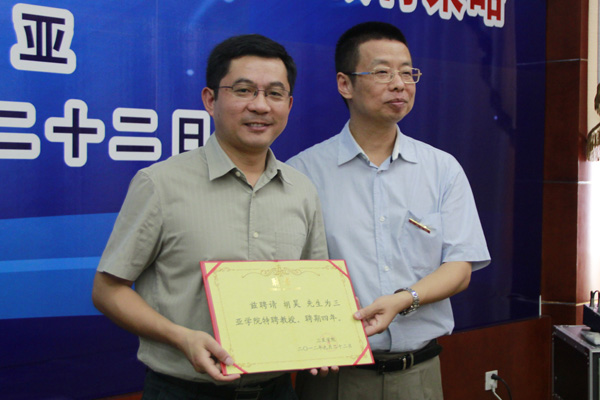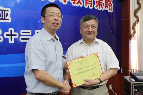 未来教育引发学者们的思考 论坛上,来访专家与我校教授、博士受陆丹院长启发,思维活跃、讨论激烈。以下是各位发言者的主要观点摘录。 中山大学社会学院院长蔡禾:知识的平民化和信息网络化,需要大学学者转变教育观念,做老百姓需要和理解的学问。现代教师和学生的关系需要重新调整,大量网络信息冲击了学生的眼球,老师不再是信息的唯一传授者而应该做学生信息的筛选者,需要正确引导和保护学生们获取知识的过程。 黑龙江大学副校长闫鹏飞:现代教育需要重新思考三方面的问题,第一,教师和学生的角色如何重新定位;第二,明确网络信息传播的利弊;第三,如何利用网络新技术服务教学。 上海社科联党组书记沈国明:新科技技术的不断创新,针对大学教育中的学风问题,借鉴港台及国外优秀的教学经验,从法律规范上出台相应条例,加大学风监管力度,改变学习懒惰、作弊等不良现象,完善现有大学管理,增强大学吸引力。 海南大学副校长刁晓平:围绕本次论坛主题和其他论坛发言学者的观点提出三点思考。第一,如何构建学术道德体系;第二,中国高等教育应该呈现何种生态环境;第三,中国高等教育如何引领经济的发展。她表示知识平民化包括质和量,不同的高校有着不同使命和职责。但是知识的创新能力、人才培养能力、社会服务能力等是相同的,必须在新形势下确定各自发展目标,在保证质的前提下让知识平民化。 三亚学院校领导沈为平:教育服务经济,同时经济也依赖教育的发展。在生物与环境的关系下人类依赖社会环境,教师和学生作为生物圈的组成部分,需要迎合当下的信息网络化的社会环境。三亚学院在海南岛的特殊环境下,也要寻求特殊的发展模式。 北京语言大学外语学院副院长陆薇:怎样建设世界一流大学,每个高等院校都要树立这样的目标,追求现代性,不断更新自身办学理念。知识不仅仅是平民化,甚至是全民化,给今天的高等院校提供机遇和挑战,社会无论怎么变化,大学最重要的使命还是要把学生培养成一个合格的人。 上海交通大学研究生院副院长胡昊:新时代下,校园课堂不会消失,网络教育形式不断发展,但是不能取代课堂教育,因为大学除了传授知识,还有很多其他的社会功能。网络逐渐影响着课堂教学,高校教学就必须随之做出调整,教师教学的中心应该转到更加关注学生人格培养和精神指引。三亚学院在这样的改革创新中,因为其灵活的体制,必定更加充满活力和生机。 黑龙江大学研究生副院长贲利:三亚学院在教育界中是有活力、轻装上阵的大学,学校开放式办学和多样化办学符合了当代的社会信息环境。民办教育肩负了新时代下教学改革的重任。 三亚学院科研处处长谌林:知识的“贵族时代”已经结束,技术进步造成的阅读功能、书写功能的改变直至消失不可挽回,已有知识规则不复存在,教师和学生对刚性知识的掌握程度的差异性降低,高等教育必须顺时而变。 三亚学院财经学院院长陆德明:中国高等教育今后的主要任务是通过知识给予学生方法和工具,帮助学生树立正确的人生观、世界观和价值观。 三亚学院管理学院教师李际:教师的课堂教学应该迎合学生群体的需求,降低知识难度,多讲实用性知识。理论性知识看似无用,其实对学生思维方式的形成起着很重要的作用。所以在改变教育体制的前提下,还是要继续传承传统教育方式的优点。 论坛结束后,陆丹教授为上海社科联党组书记沈国明、北京语言大学外语学院副院长陆薇以及上海交通大学研究生院副院长胡昊颁发了三亚学院特聘教授聘书,为三亚学院发展集结更多人才资源。
