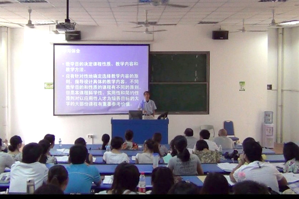 沈为平教授主讲《我读教学大纲》 作为第三阶段培训的教授讲课第一讲,校领导沈为平教授的讲课主题是《我读教学大纲》,他以安徽师范大学的古代汉语课程为例解读教学大纲。他认为,“教学大纲在课堂教学系列文件中起提纲挈领的作用。它上承学校的学生培养目标和办学理念、专业培养计划和课程体系,下引教学日历、教材、教案、参考资料、题库、练习和考试。”他指出本阶段培训的重点,“青年教师近期在教学方面主要掌握课堂教学的基本功,提高教学技能。同时要认识教学的目的是教给学生有用的知识和能力,教学技巧只是达到这一目的的手段。”他鼓励青年教师,“高质量的教学依靠教师对课程内容整体全面深刻的掌握,是优秀教师一辈子的任务。”