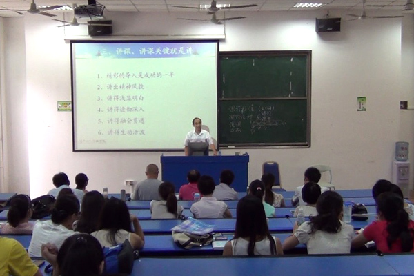 王元元教授主讲《漫谈课堂教学—提高基本素养,才能过关斩将》 如何让一名新教师少走弯路,使教学效果更佳,王元元教授的《漫谈课堂教学—提高基本素养,才能过关斩将》的讲座给青年教师们提供了很多可以借鉴的经验。王教授强调做好课程设计、板书设计的重要性,并且鼓励青年教师多向老教师学习,自信自强,见其所长,形成自己特有的魅力和风格,同时让学生乐于学习、敢于提问,培养学生的求索精神。王教授认为,“一堂课有着精彩的导入、讲出精神风貌、讲得浅显明白、透彻深入、融会贯通、生动活泼,能够做到这六点,这样的一课一定很精彩。” 王教授提出了青年教师刚刚走上讲台,要“过五关”、“斩六将”,“过五关”包括“语言关、节奏关、板书关、逻辑关、经验关”。“斩六将”指一些青年教师讲课中出现的问题,“声音含混不清、读教材念课件、节奏千篇一律、层次不分不明、心中没有学生”。王教授讲课语言凝练、句句铿锵。他全身心地投入讲授,以鲜活的实例把对教学的理解和挚爱融入讲解,引导和感染着青年教师们。