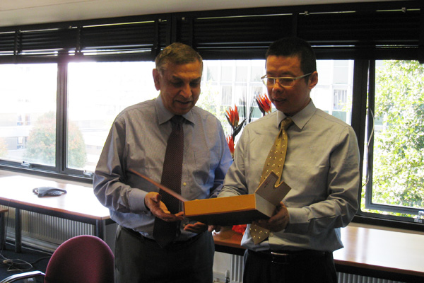 Professor Sujit Banerji of the University of Warwick giving a gift to Lu Dan and wishing that the friendship between the two schools will be of long standing