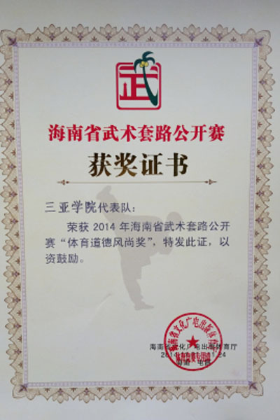 三亚学院代表队在武术套路公开赛中获“体育道德风尚奖”日前,由海南省文化广电出版体育厅主办的2014武术套路公开赛举办,体育学院郝艳龙老师带领三亚学院代表队参赛,荣获“体育道德风尚奖”。