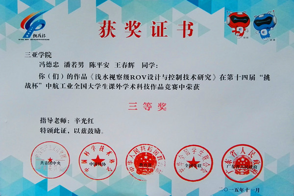 11月20日,由共青团中央、中国科协、教育部、全国学联、广东省人民政府共同主办的第十四届“挑战杯”全国大学生课外学术科技作品竞赛决赛在广东举行。我校理工学院辛光红教师指导,学生冯德忠、潘若男等人完成的《浅水视察级rov设计与控制技术研究》项目在1569件作品中脱颖而出,荣获本次大赛三等奖。