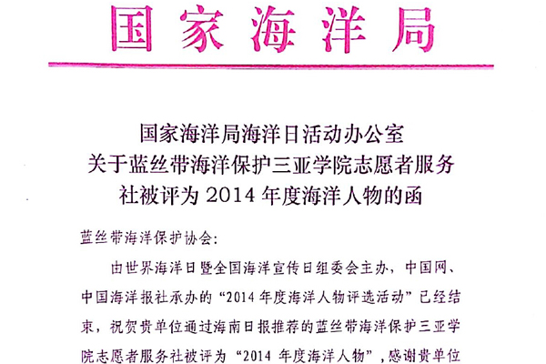 2015年5月,国家海洋局日前公布“2014年度海洋人物”评选结果,我校蓝丝带海洋保护志愿者服务社团被评为中国“2014年度海洋人物”。据了解,此次评选活动由国家海洋局世界海洋日暨全国海洋宣传日组委会主办,来自国家海洋局、海军政治部、教育部、国土资源部、交通运输部、农业部、共青团中央等单位的多位评委投票产生。该活动自2009年举办至今已有六届,旨在表彰为中国海洋事业做出突出贡献的个人和团体。中国工程院院士金翔龙、“潜龙一号”潜水器总设计师徐会希,“雪龙”号极地科学考察船群体,索马里海域护航编队官兵,中国海监南海维权执法支队支队长缪文波等个人和团体先后荣获过该荣誉。